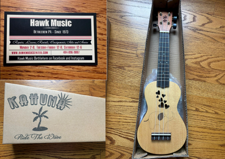 Ride the wave! Thanks to our friends at Hawk Music Bethlehem for their donation of this beautiful Kahuna Soprano Ukulele that features a mahogany plywood body, mahogany neck, rosewood fretboard, 12 frets, and a laser-etched graphic on the body for a unique twist on a classic instrument.