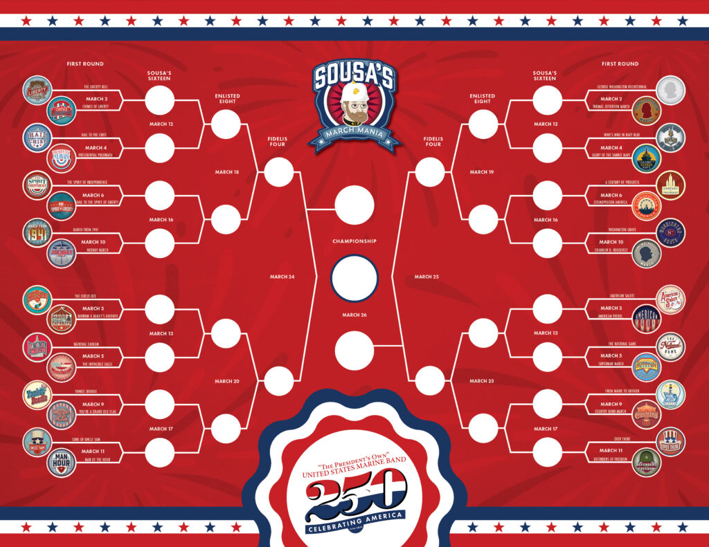 “The President’s Own” hosts its annual “Sousa’s March Mania,” a tournament pitting 32 musical marches against each other for voters to decide which one will be crowned the year’s champion march. Every weekday marches will compete head-to-head while our friends and fans vote for marches to advance in the tournament. This year the competition celebrates America 250!