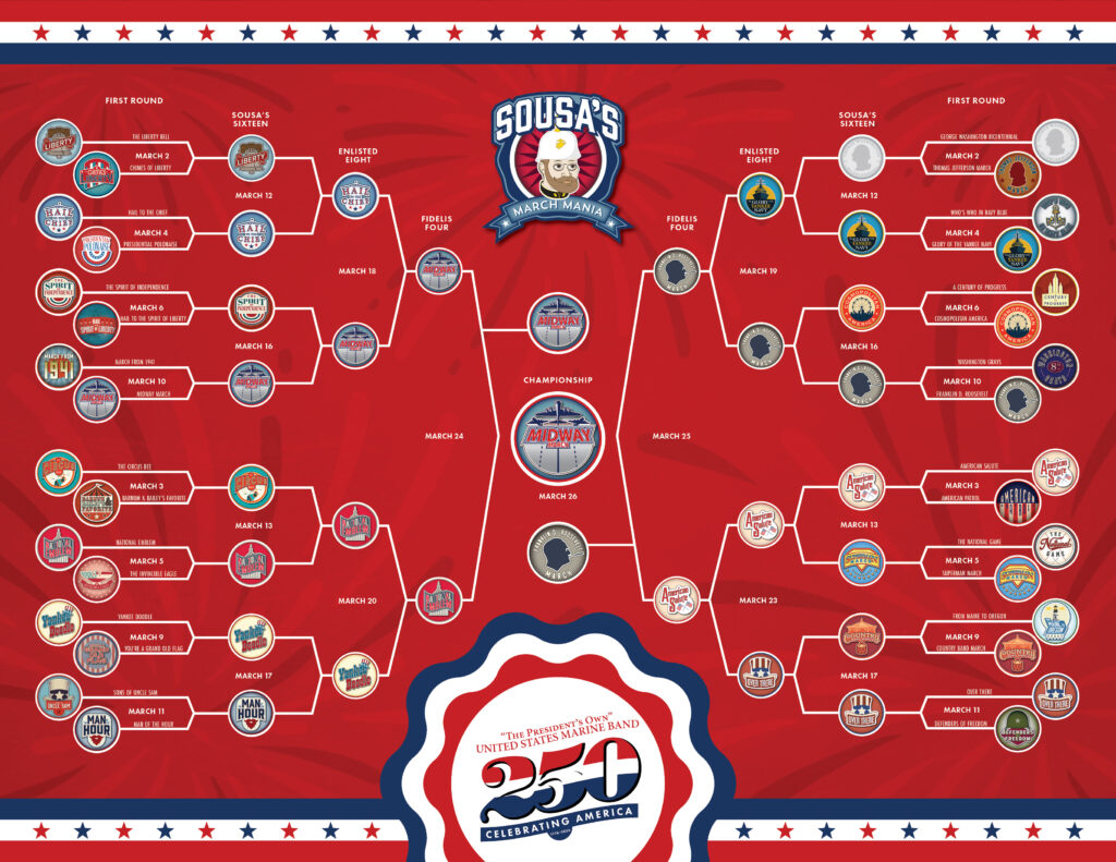 “The President’s Own” hosts its annual “Sousa’s March Mania,” a tournament pitting 32 musical marches against each other for voters to decide which one will be crowned the year’s champion march. Every weekday marches will compete head-to-head while our friends and fans vote for marches to advance in the tournament. This year the competition celebrates America 250!